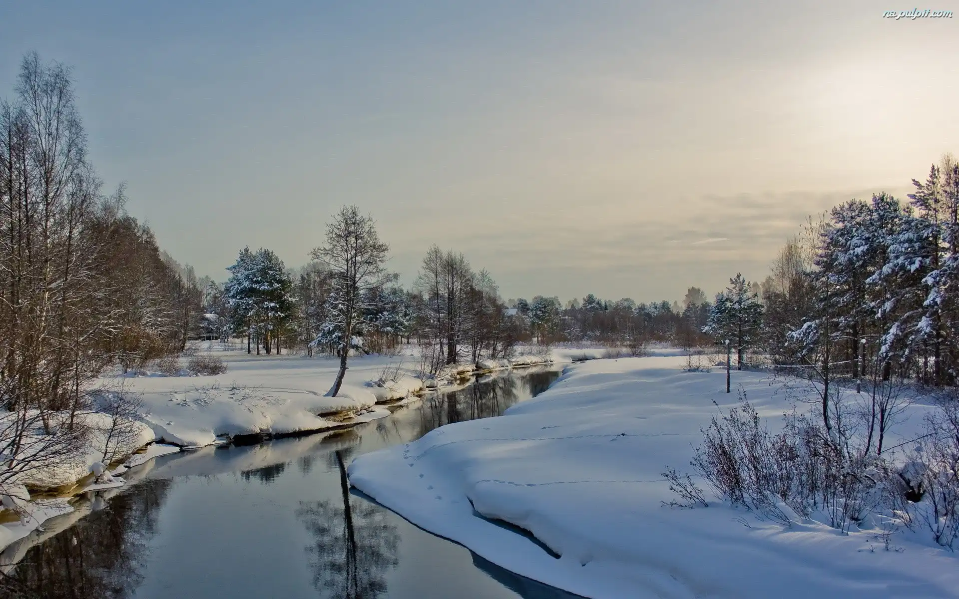 Zima, Åšnieg, Rzeka, Drzewa Na Pulpit