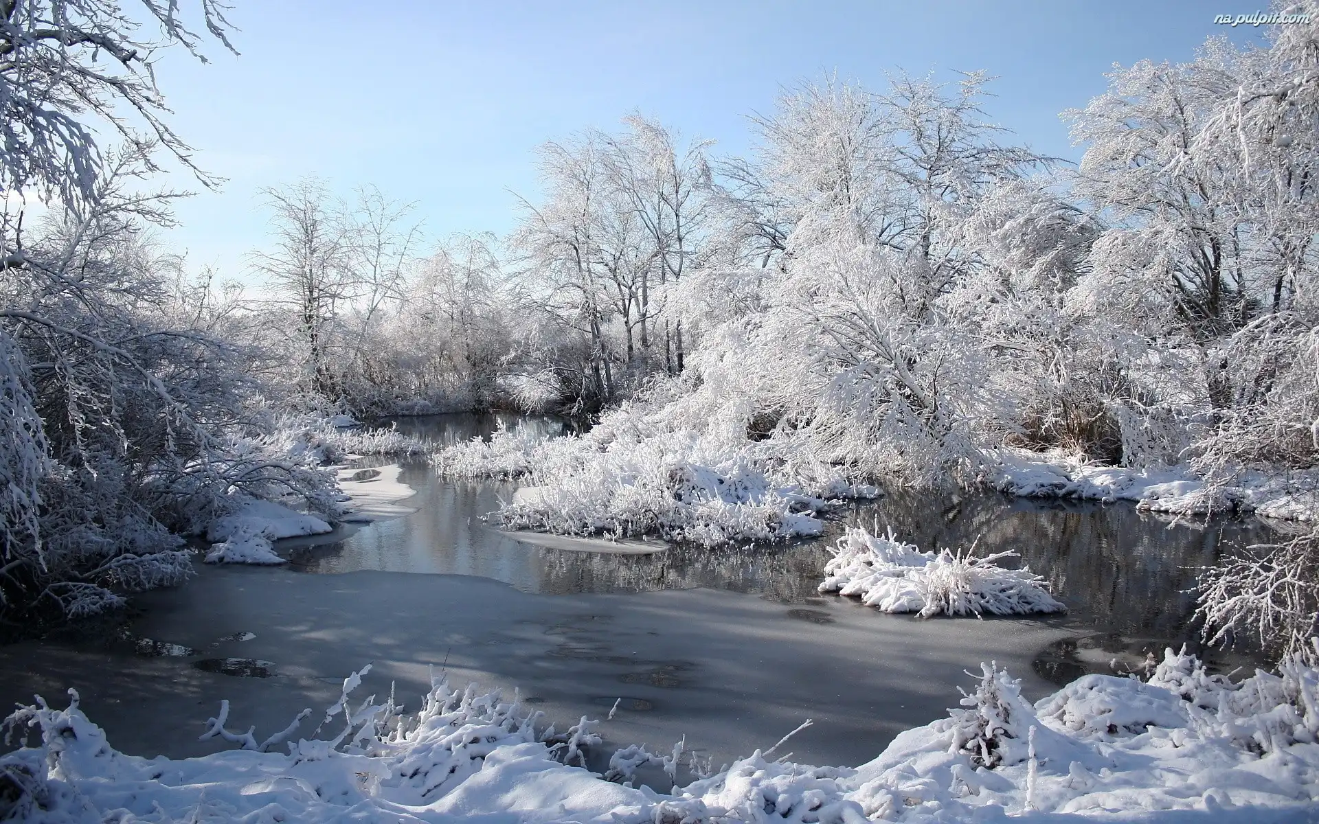 Zima, Ośnieżone, Rzeka, Drzewa