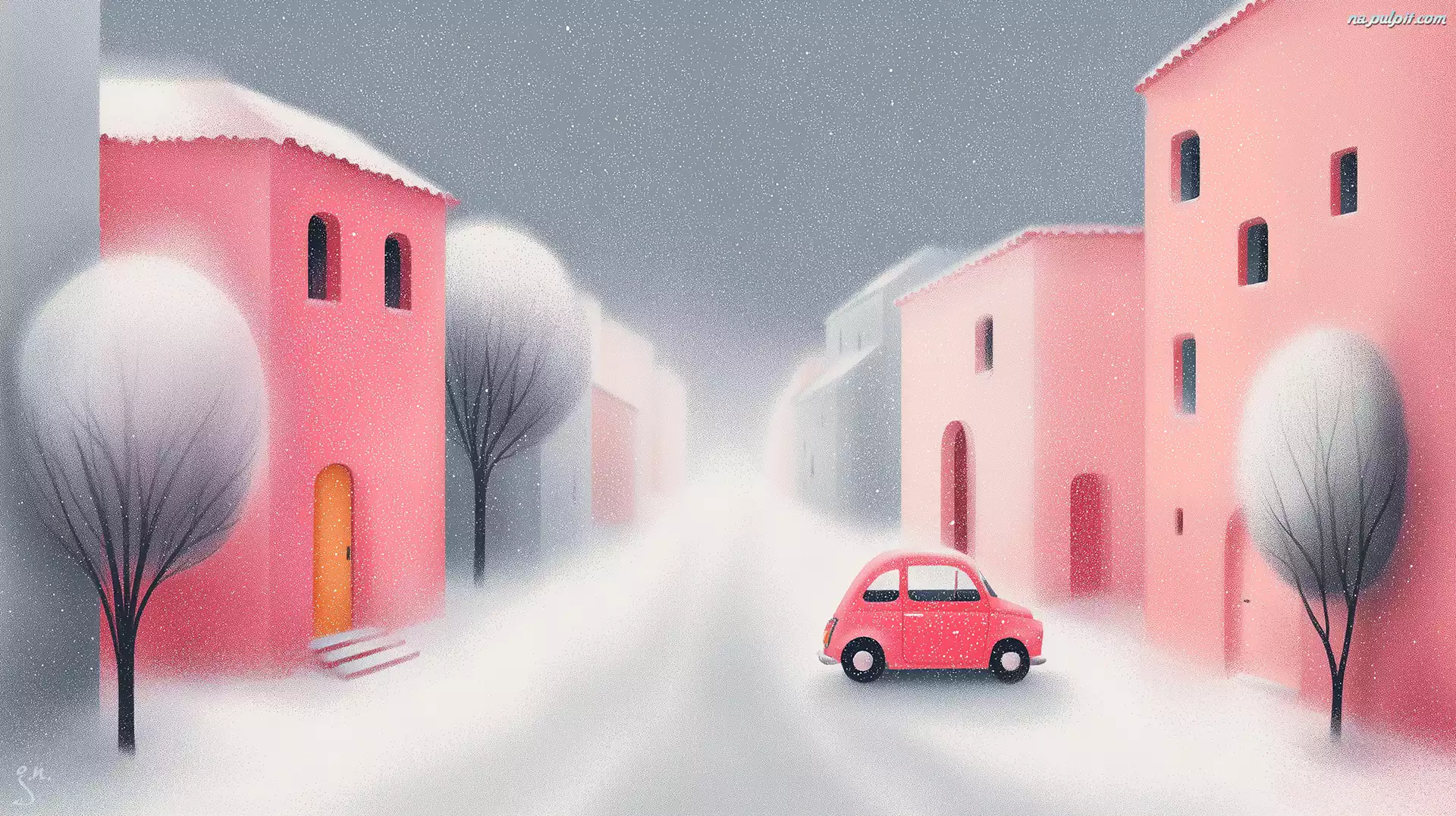 Drzewa, Różowe, Samochód, Zima, Domy, Grafika AI Na Pulpit