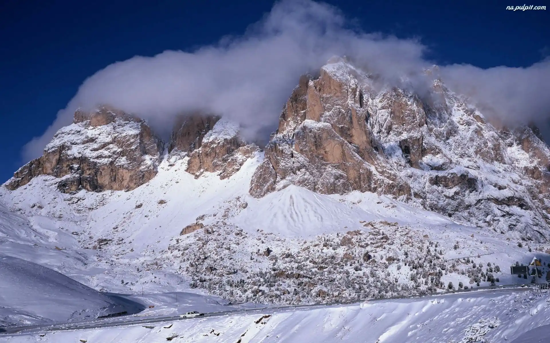 Zima, Droga, Góry, Skaliste, Chmury Na Pulpit