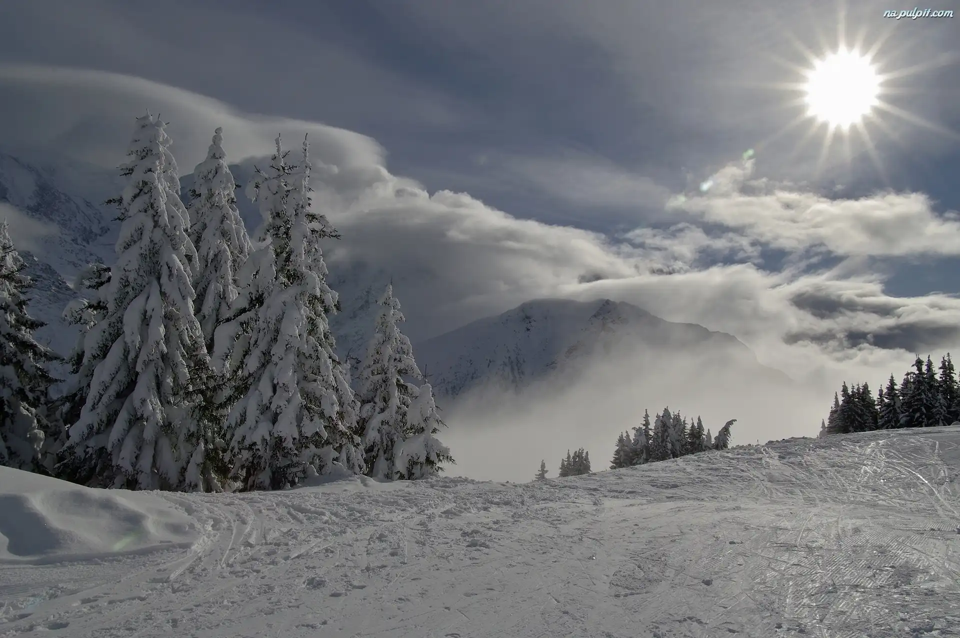 Zima, Góry, Chmury, Promienie Słońca, Świerki