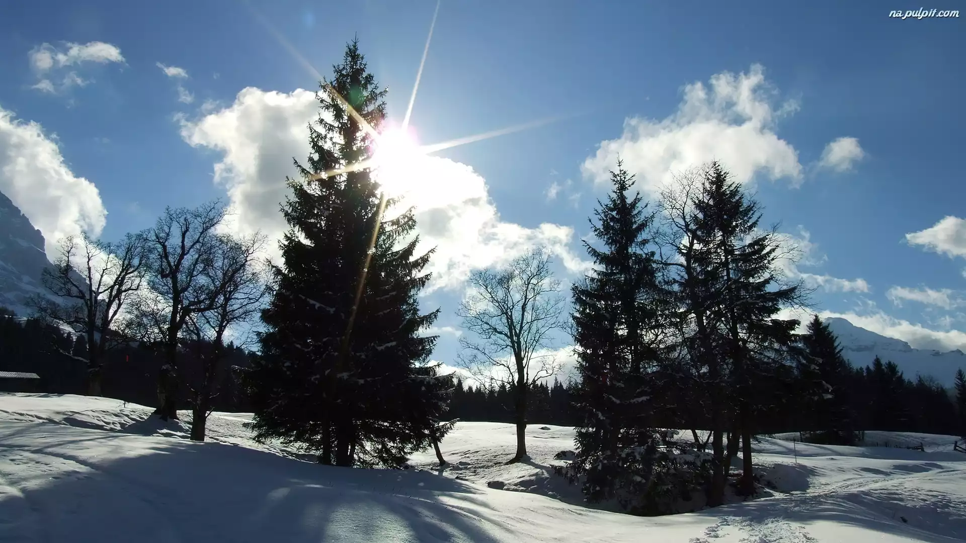 Zima, Śnieg, Słońce, Drzewa