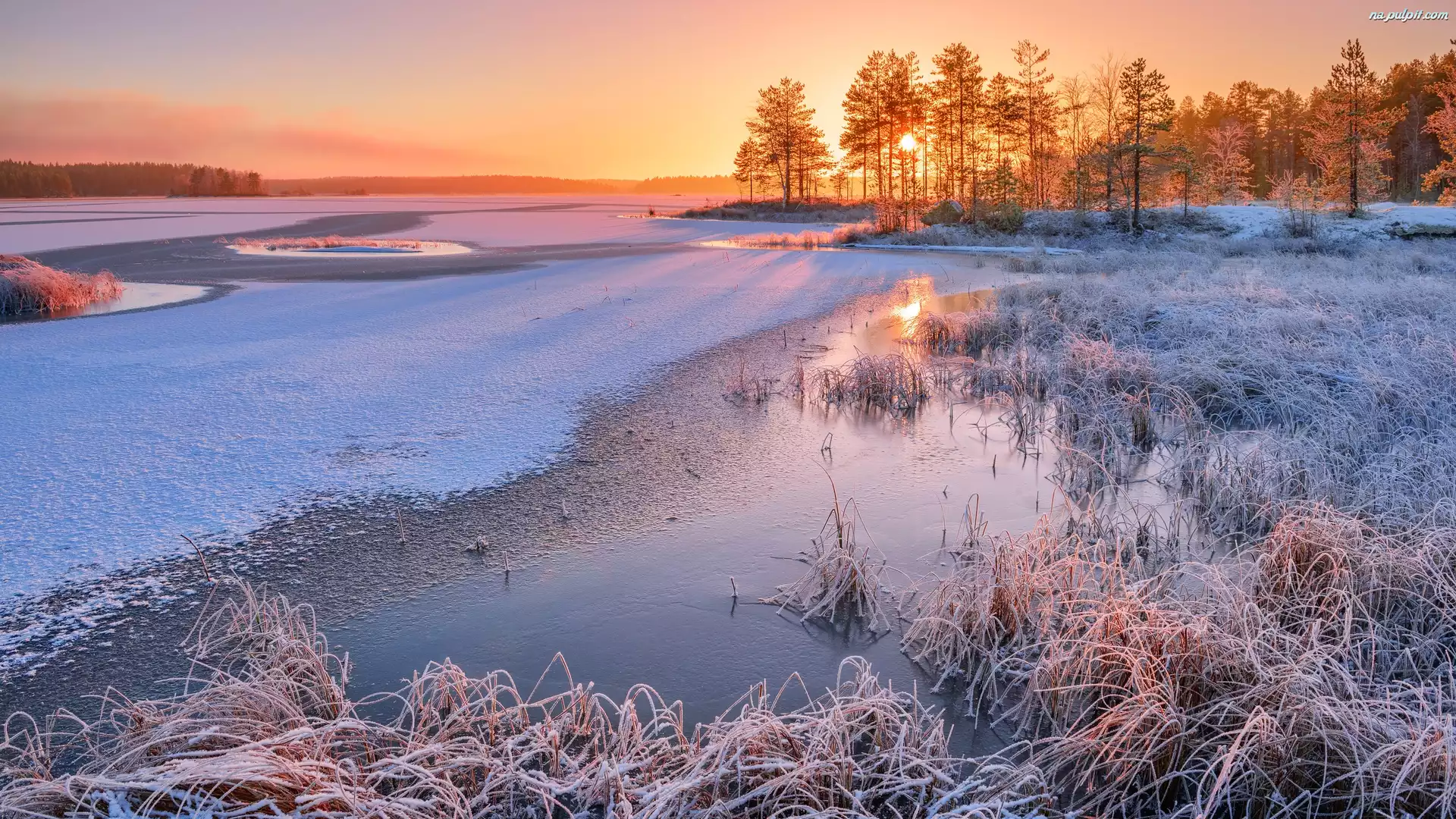 Dzień, Oszronione, Szuwary, Zima, Jezioro, Drzewa, Słoneczny Na Pulpit