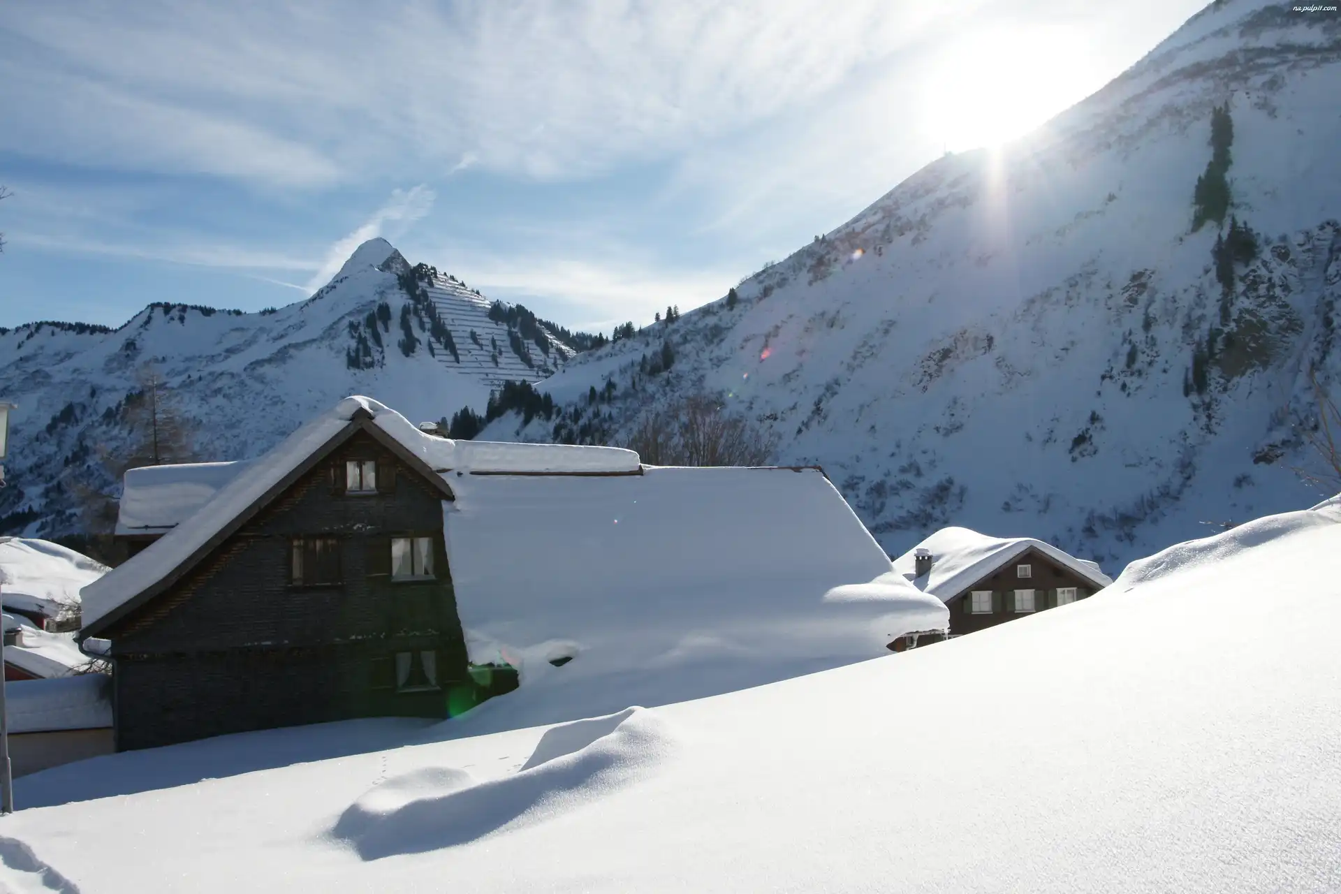Śnieg, W, Domki, Zima, Górach Na Pulpit