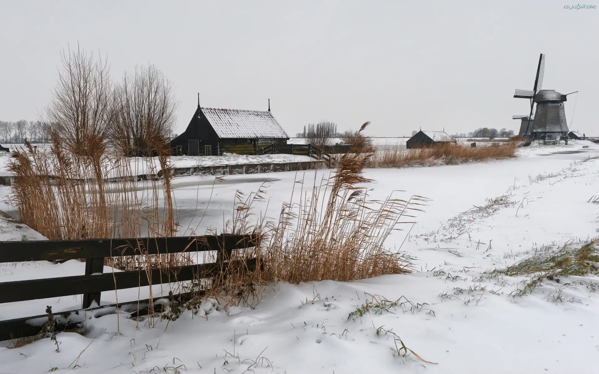 Zima, Rzeka, Zabudowania, Wiatrak, Most