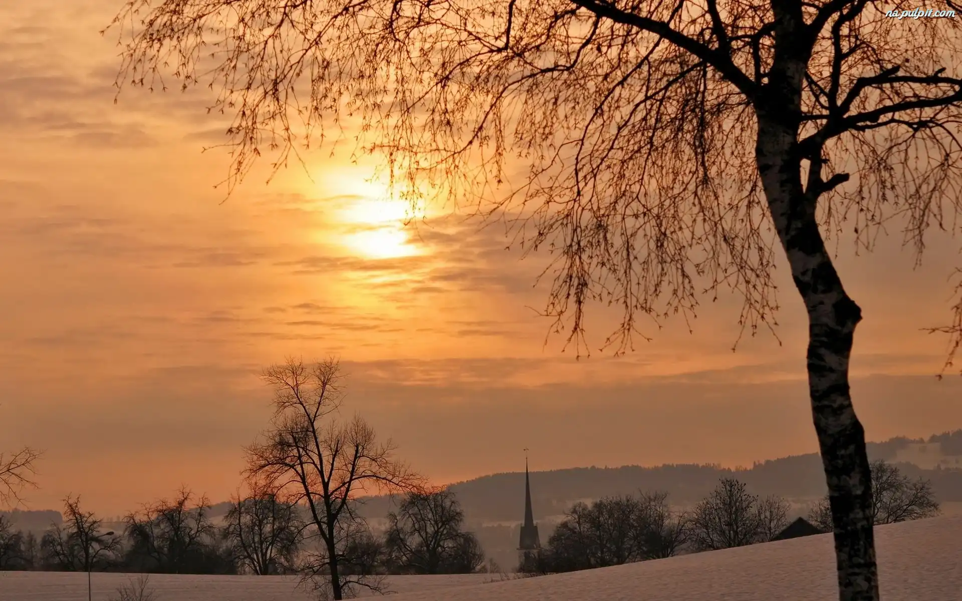 Zima, Drzewa, Pola, Zachód Słońca Na Pulpit