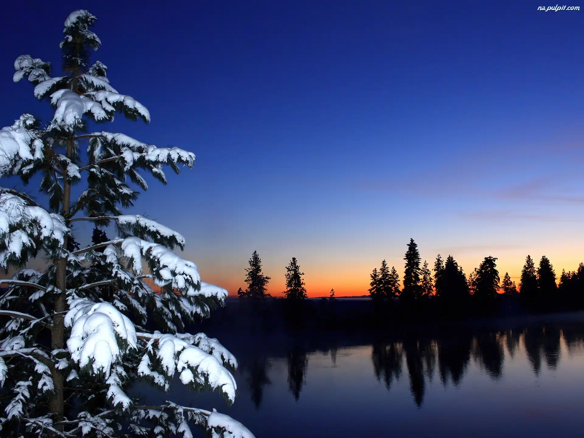Świerk, Zachód, Rzeka, Zima, Słońca Na Pulpit