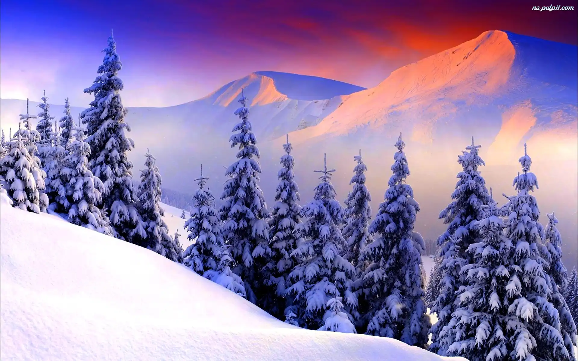 Zima, Góry, Słońca, Zachód, Drzewa Na Pulpit