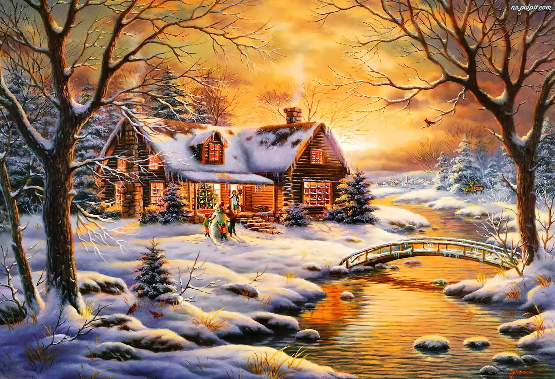 Zima, Rzeczka, Słońca, Zachód, Domek