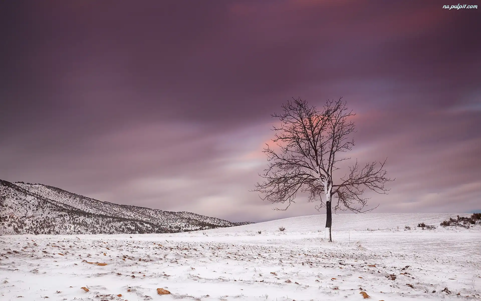 Zima, Samotne, Słońca, Zachód, Drzewo