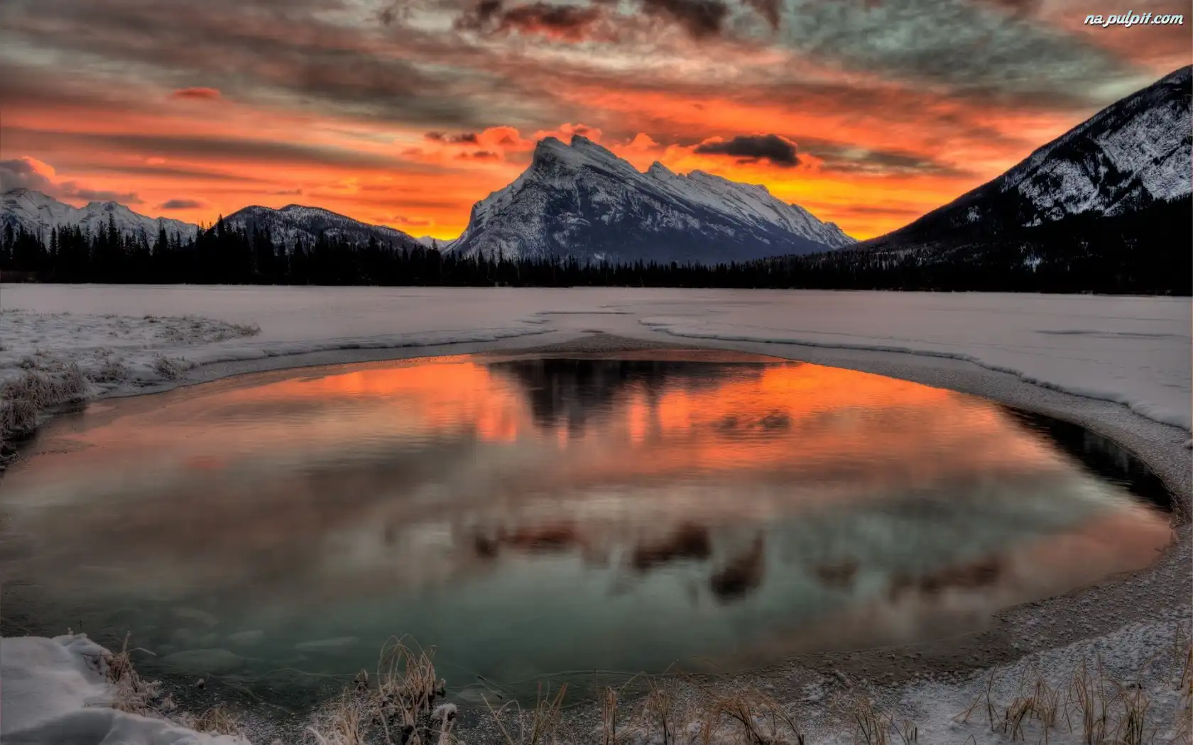 Zima, Skały, Słońca, Zachód, Jezioro Na Pulpit
