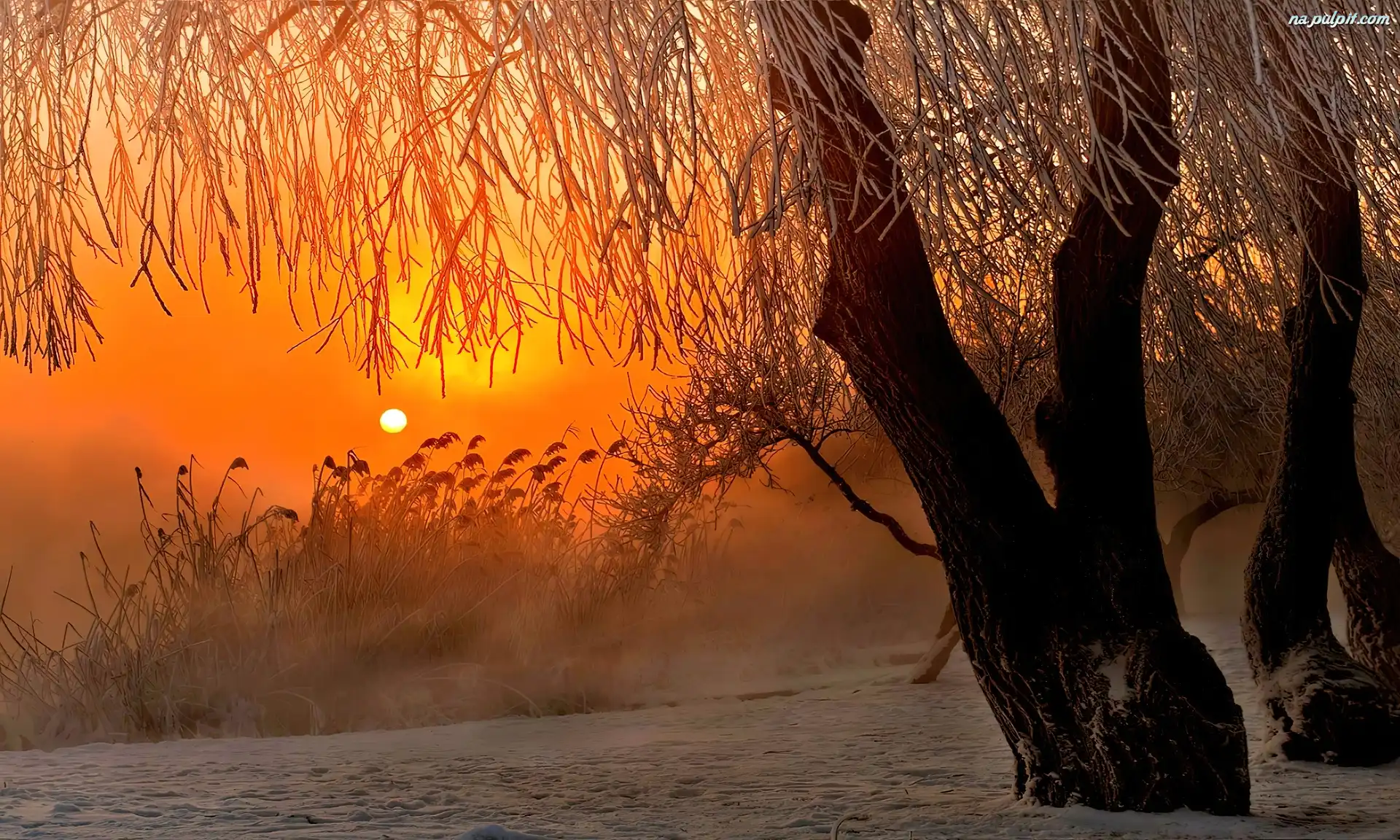 Zima, Słońca, Zachód, Wierzby Na Pulpit