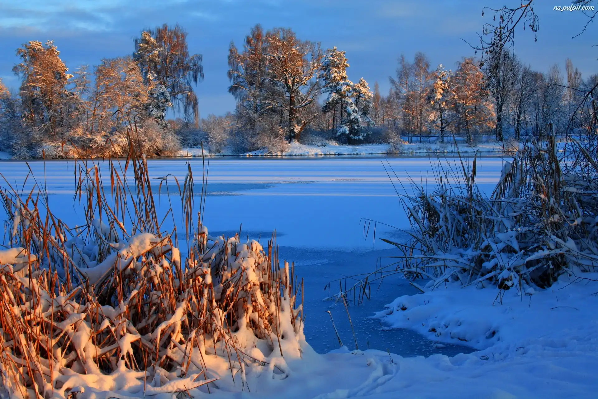 Zima, Drzewa, Jezioro, Zamarznięte, Krzewy Na Pulpit