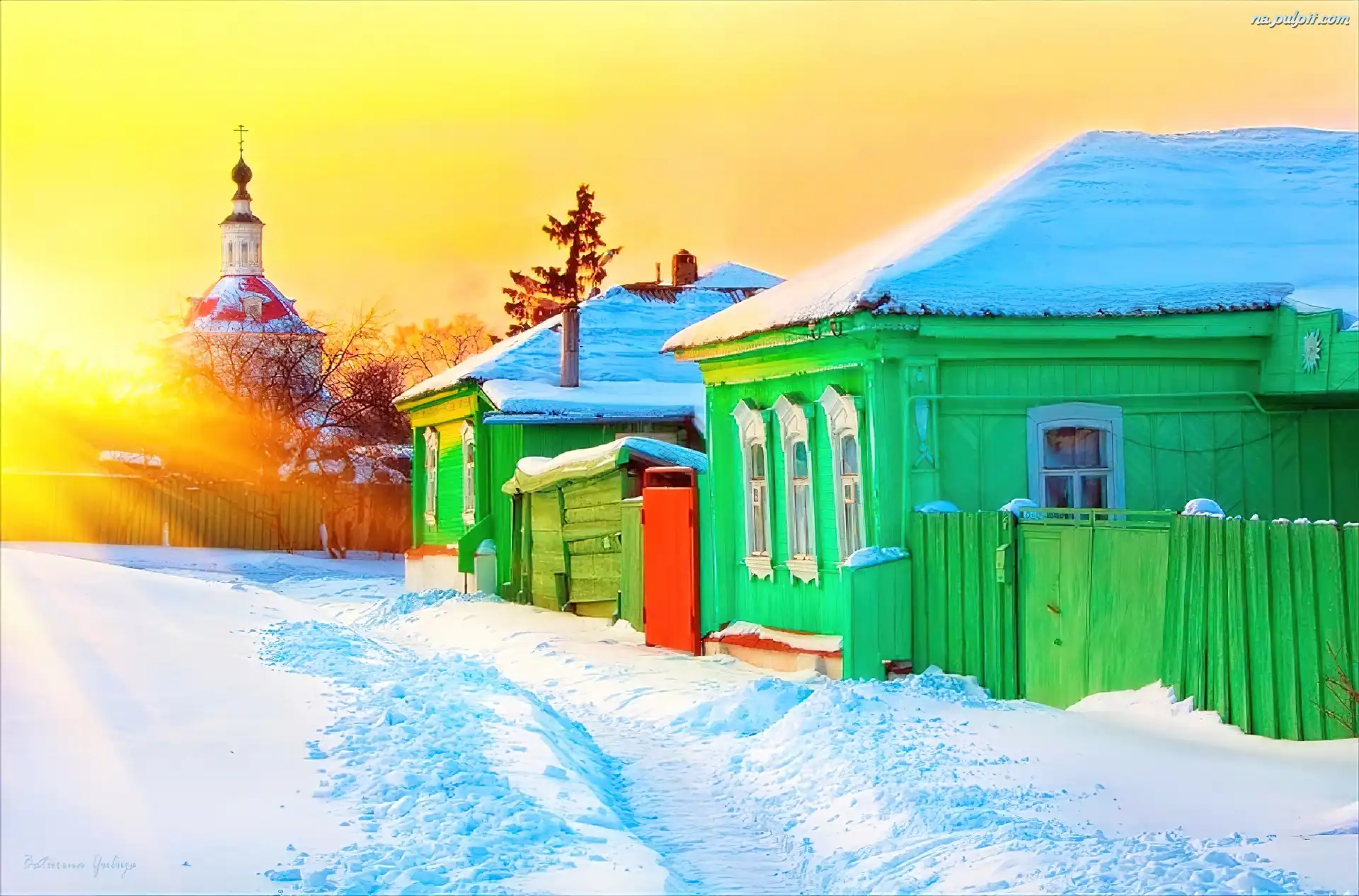 Zima, Domy, Zielone, Śnieg Na Pulpit