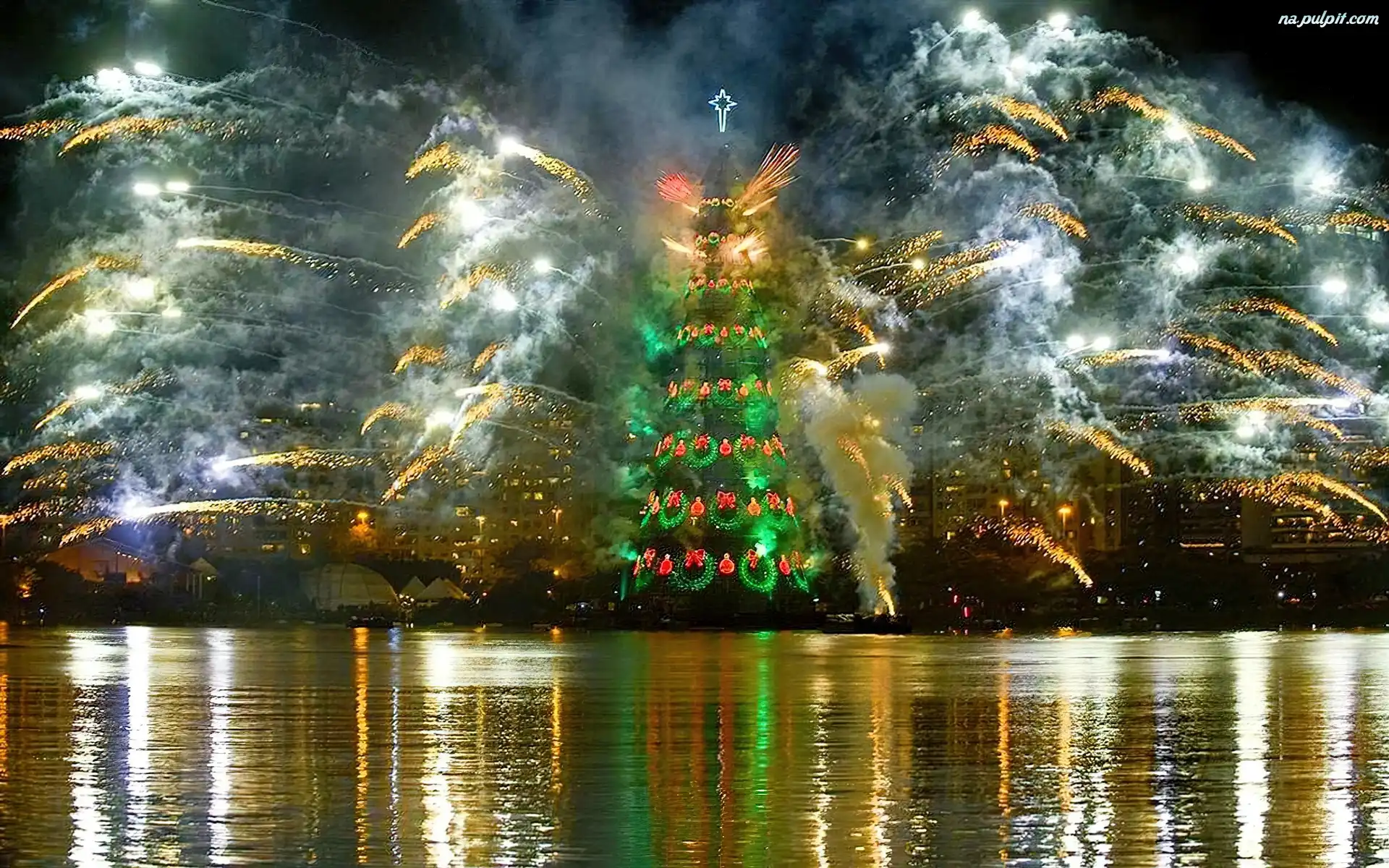 Zimne, Miasto, Choinki, Ognie, Sylwester, Jezioro