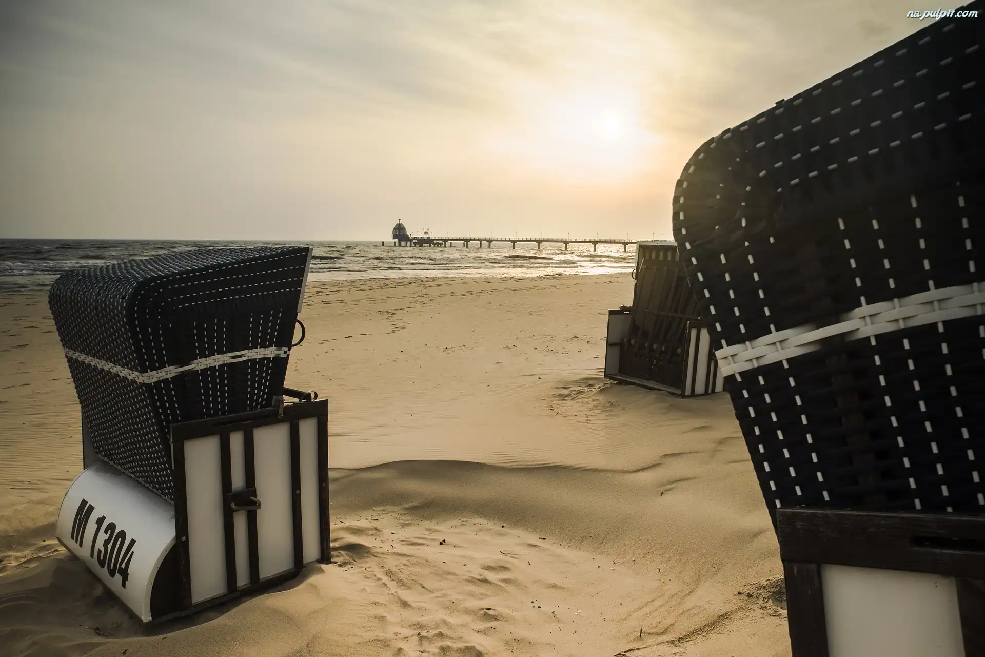 Morze, Zinnowitz, Niemcy, Molo, Plaża, Kosze plażowe Na Pulpit