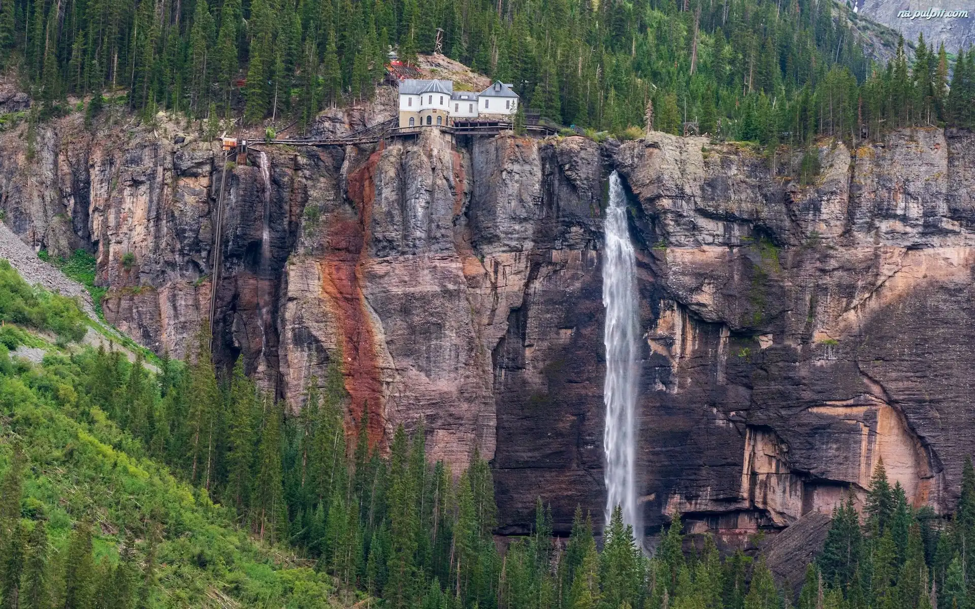 Bridal Veil Falls, Skały, Telluride, Stany Zjednoczone, Dom, Drzewa, Kolorado, Wodospad Na Pulpit