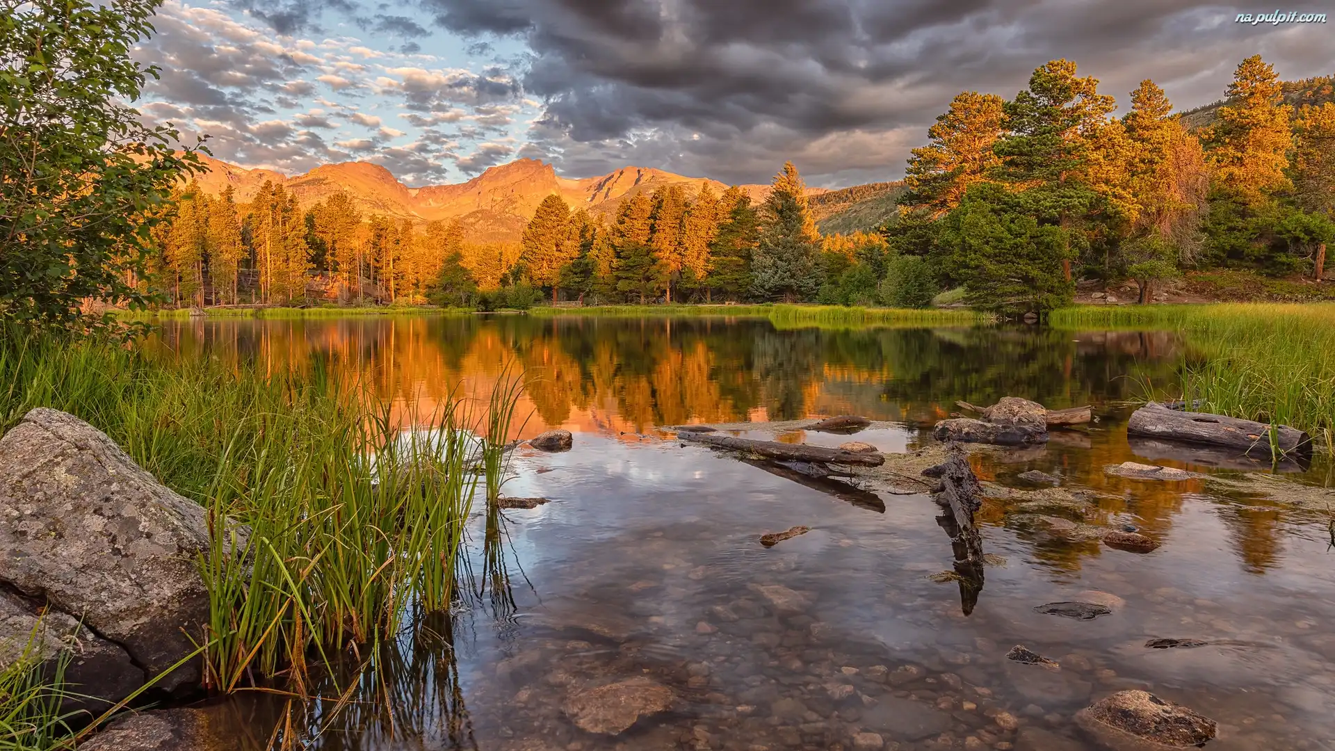 Spraque Lake, Park Narodowy Gór Skalistych, Drzewa, Stany Zjednoczone, Wschód słońca, Kamienie, Kolorado, Jezioro Na Pulpit |