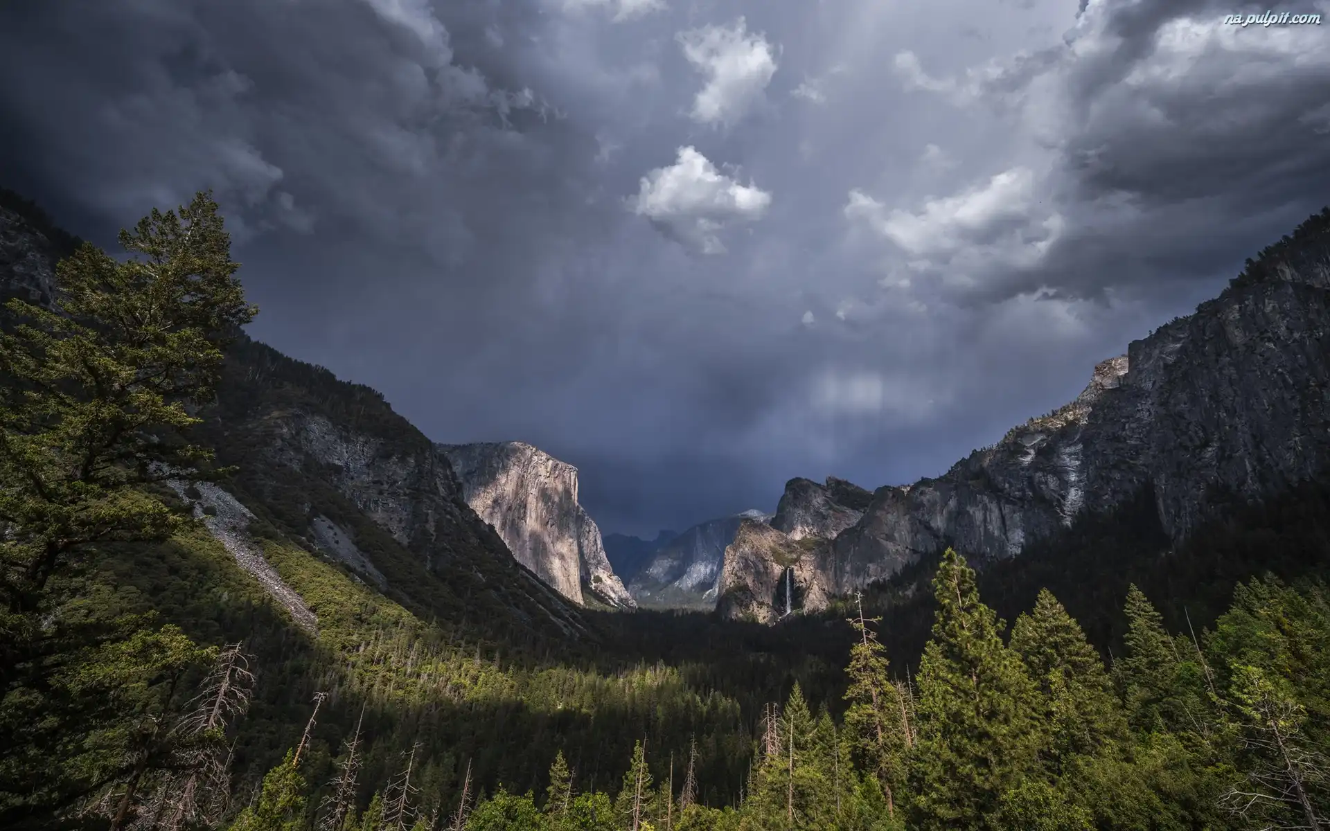 Niebo, Chmury, Kalifornia, Drzewa, Las, Park Narodowy Yosemite, Stany Zjednoczone, Pochmurne, Góry Na Pulpit |