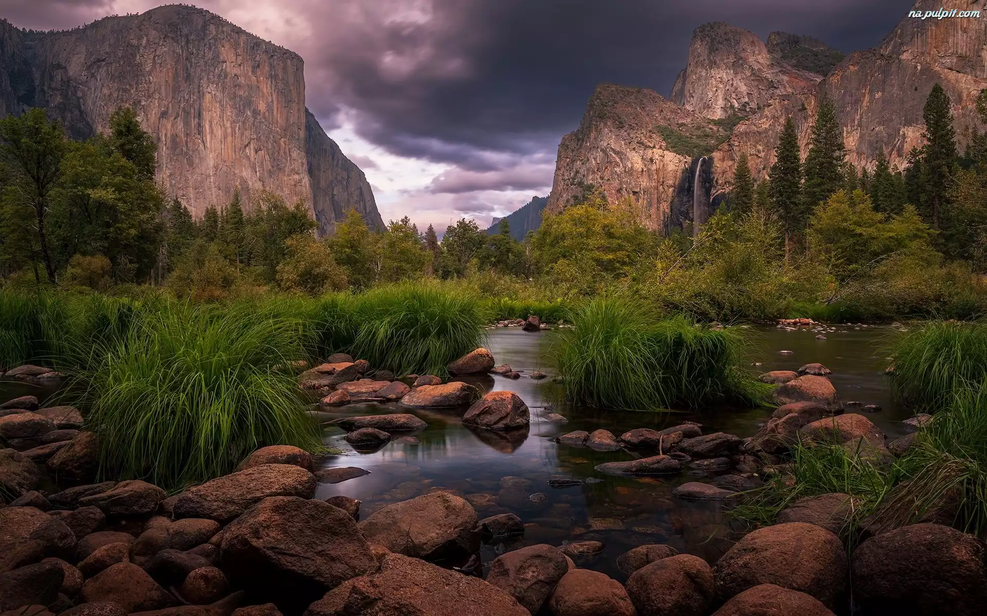 Trawa, Roślinność, Kalifornia, Góry, Rzeka, Park Narodowy Yosemite, Stany Zjednoczone, Chmury, Kamienie Na Pulpit |