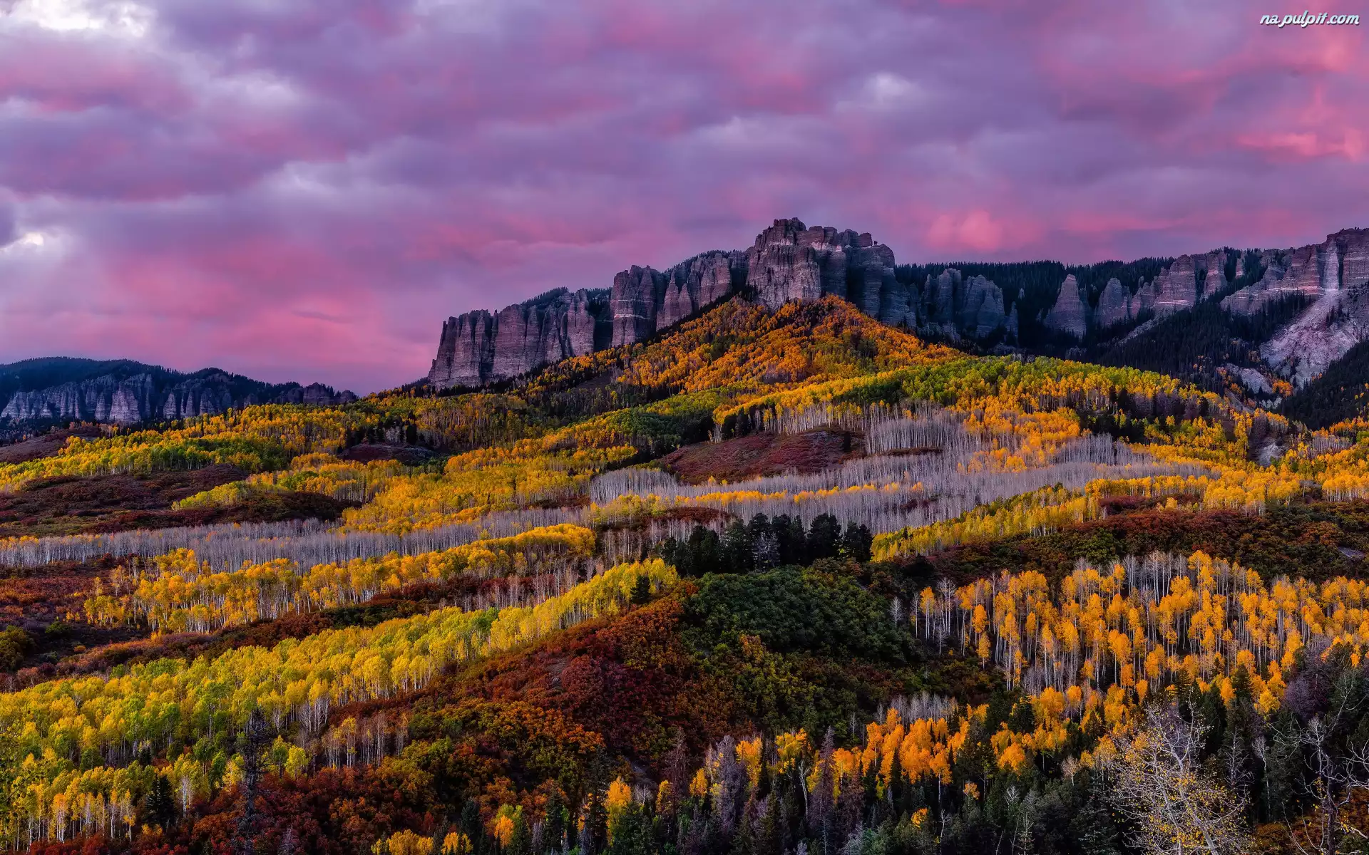Las, Niebo, Kolorado, Jesień, Góry, San Juan Mountains, Stany Zjednoczone, Drzewa, Skały Na Pulpit |