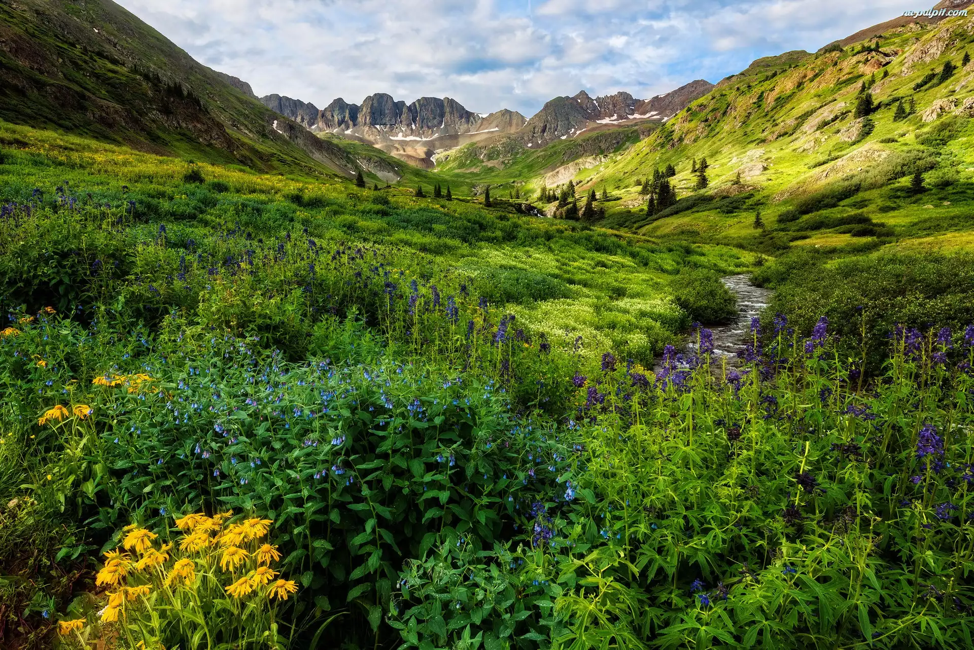 Strumyk, Poranek, Kolorado, San Juan Mountains, Łąka, Góry, Stany Zjednoczone, Kwiaty, Kolorowe Na Pulpit |