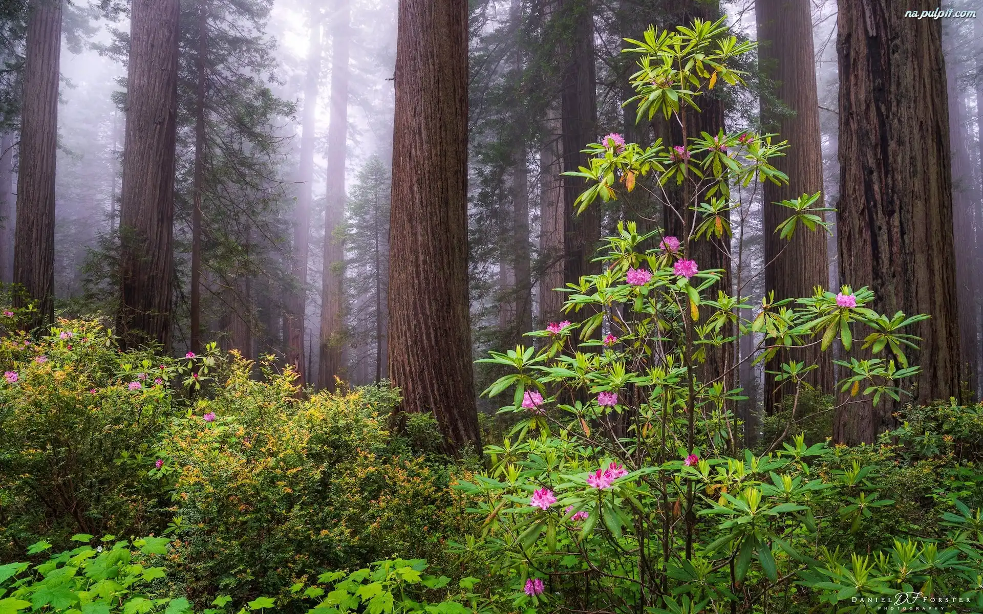 Sekwoje, Park Narodowy Redwood, Różanecznik, Stany Zjednoczone, Mgła, Krzewy, Kalifornia, Drzewa Na Pulpit |