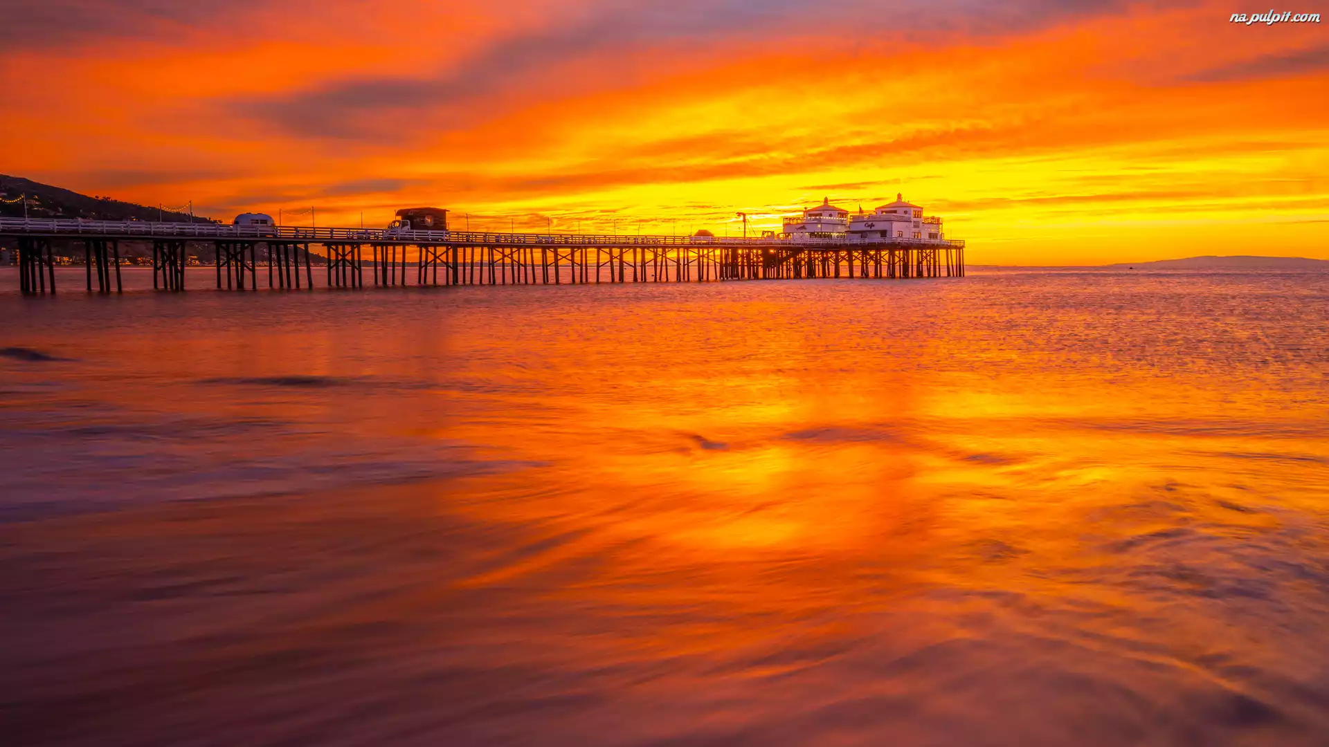 Kalifornia, Molo, Wschód słońca, Malibu, Morze, Stany Zjednoczone Na Pulpit
