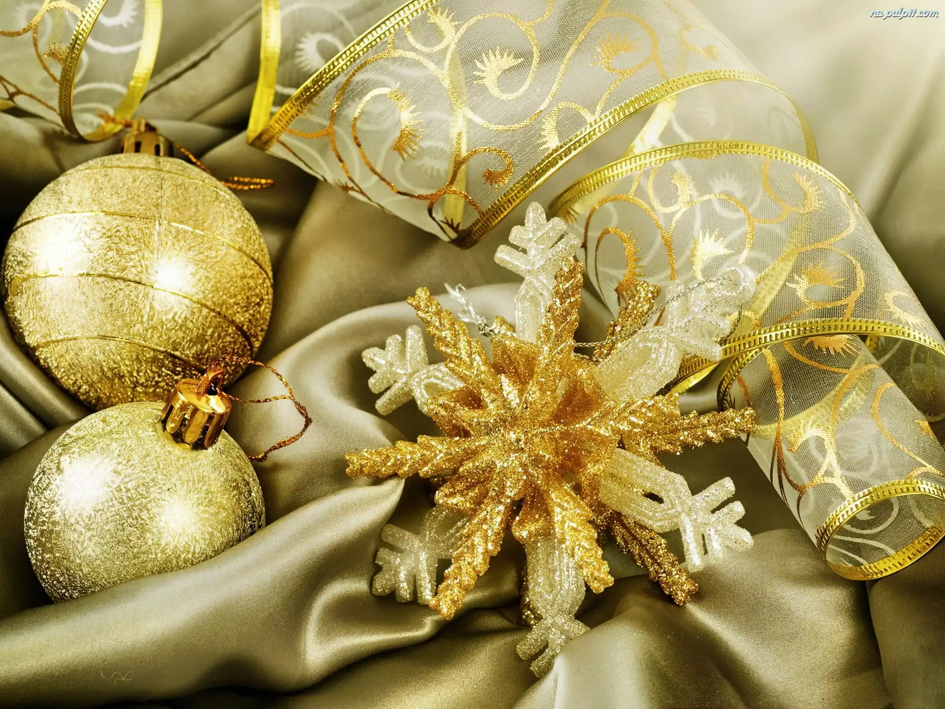 Święta, Wstążka, Bombki, Złote, Gwiazdka