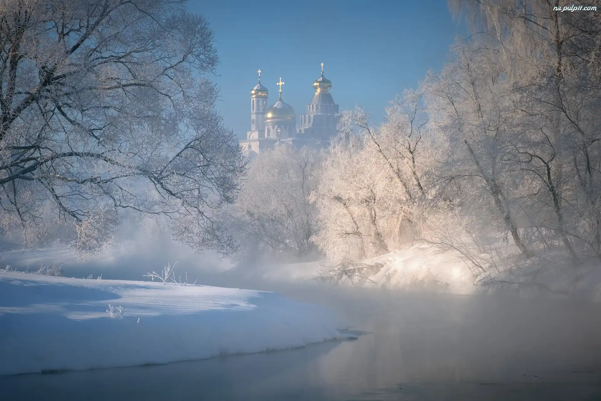 Rzeka Istra, Cerkiew, Monaster Zmartwychwstania Pańskiego, Nowe Jeruzalem, Obwód moskiewski, Rosja, Ośnieżone, Zima, Drzewa Na Pulpit |