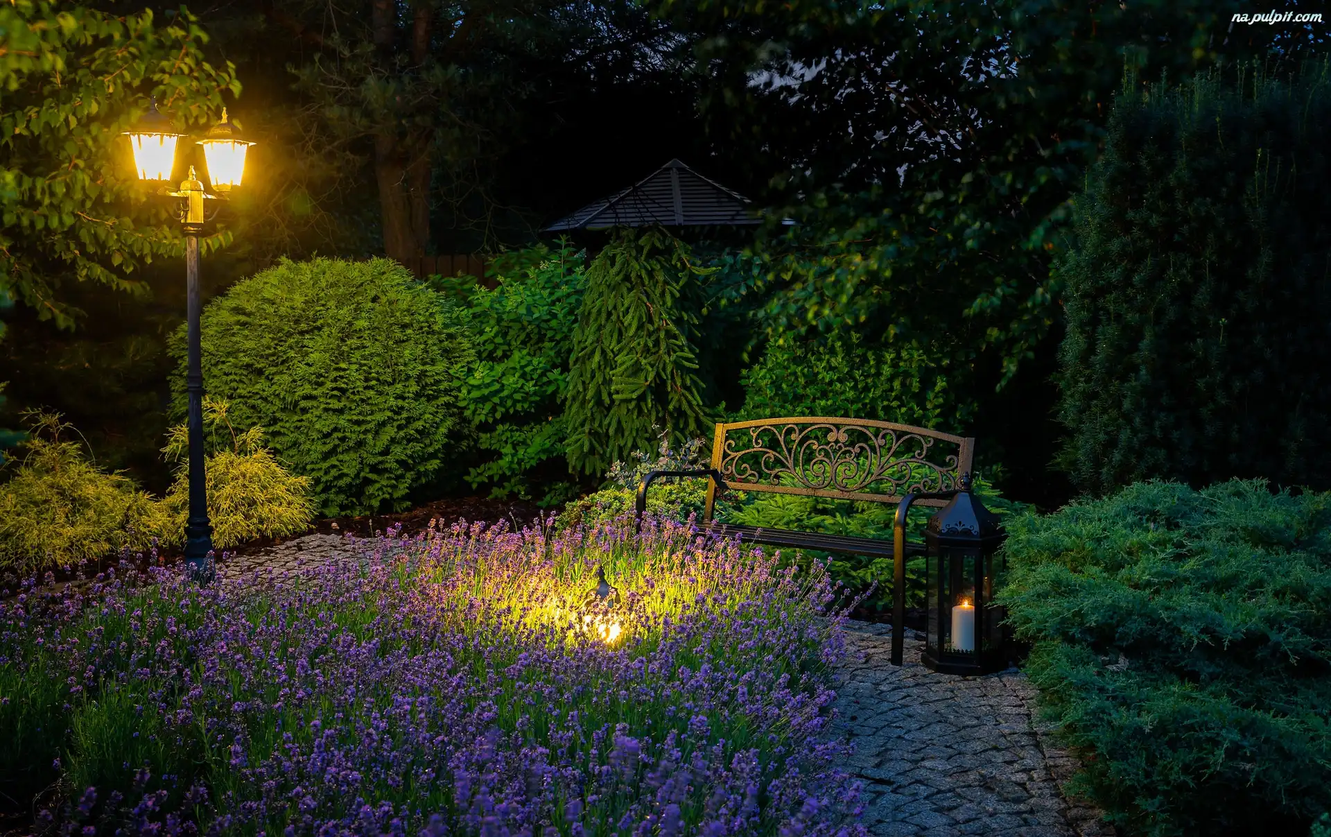 Zmrok, Ławka, Ogród, Lampa