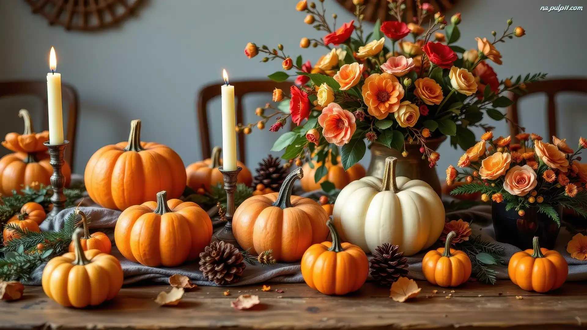 Szyszki, Kwiaty, Bukiet, Żółte, Białe, Dynie, Świece