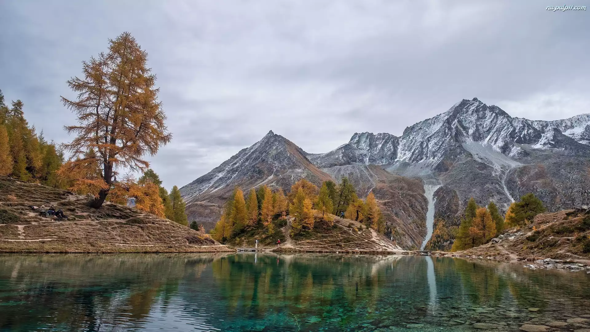 Żółte, Jezioro, Drzewa, Jesień, Szwajcaria, Modrzewie, Góry, Lac Bleu Na Pulpit