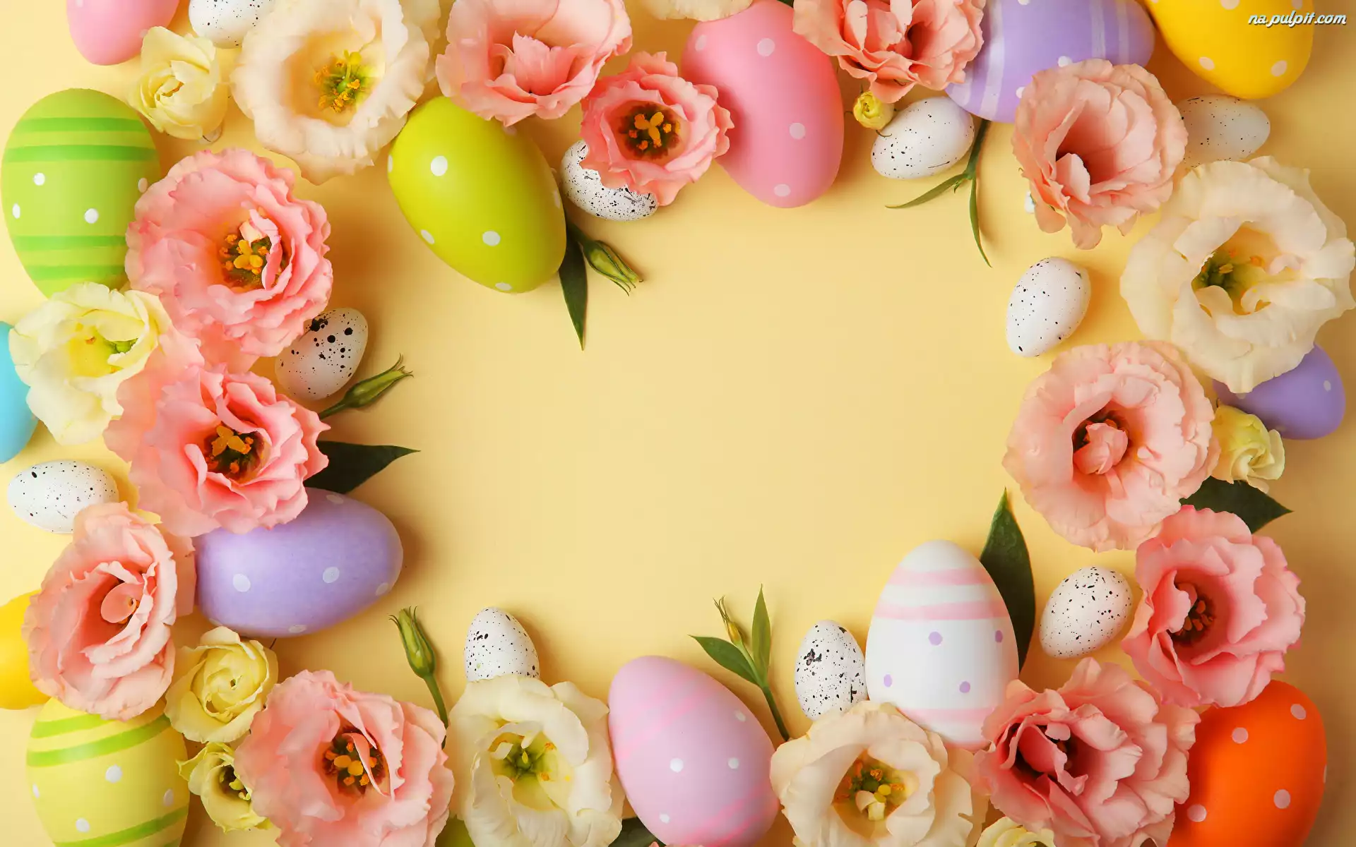 Pisanki, Różnokolorowe, Kwiatki, Żółte tło, Kolorowe Na Pulpit