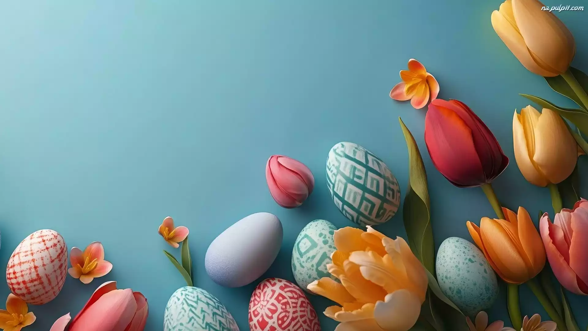 Czerwone, Pisanki, Tulipany, Wielkanoc, Tło, Niebieskie, Kolorowe, Żółte Na Pulpit