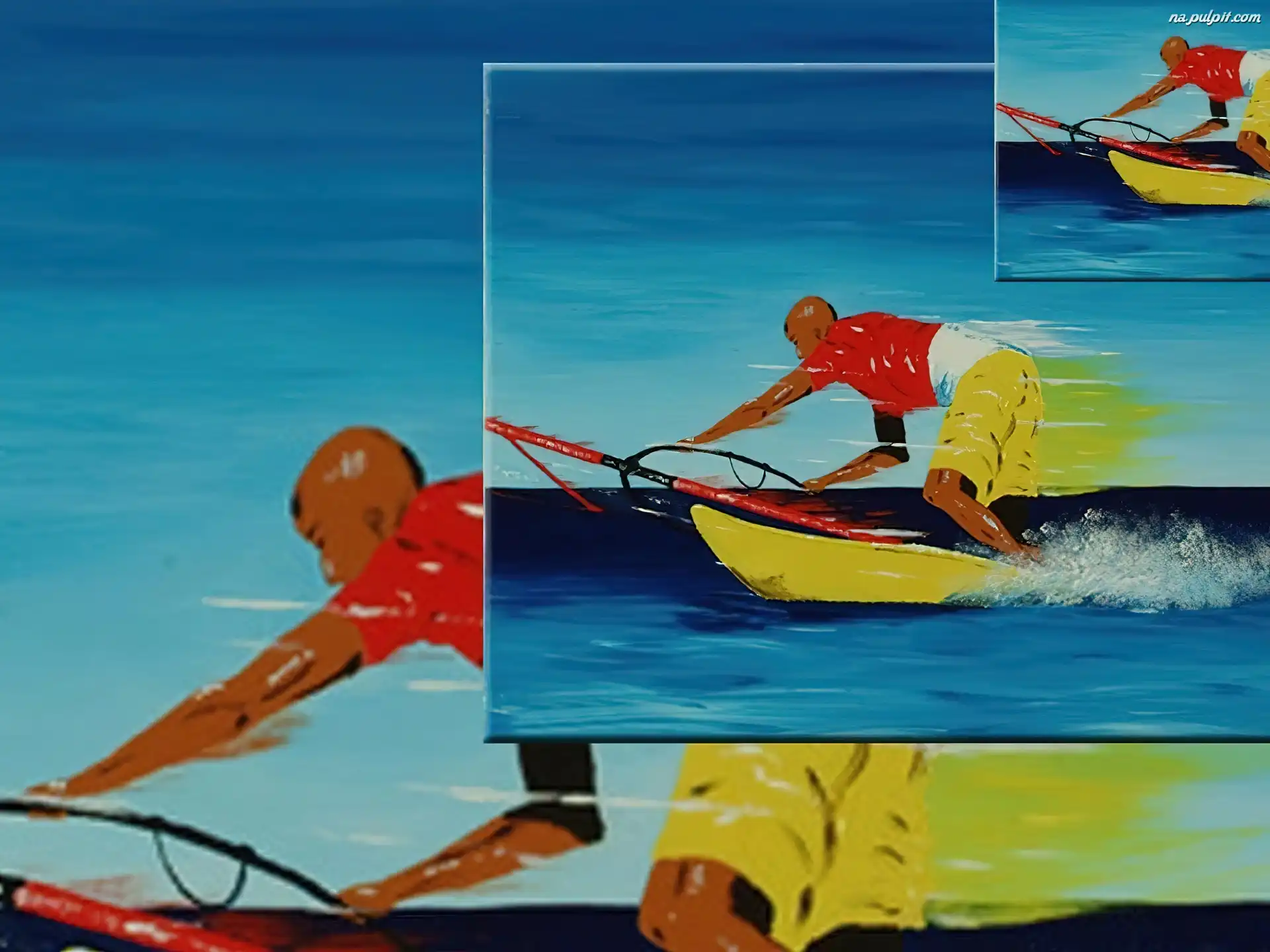 żółte spodenki, żagiel , deska, Windsurfing, morze Na Pulpit