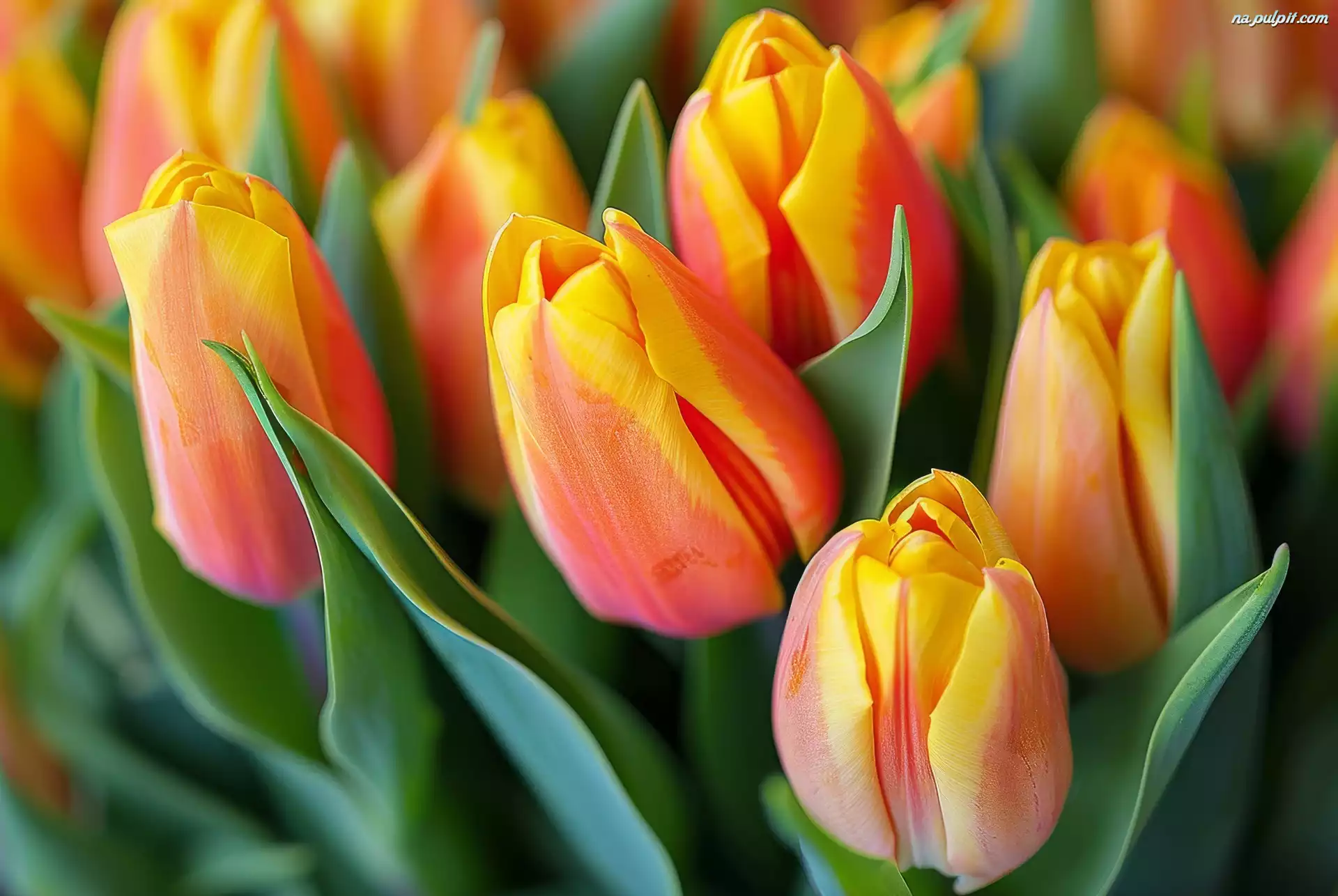 Tulipany, Żółto-czerwone, Liście, Zbliżenie Na Pulpit