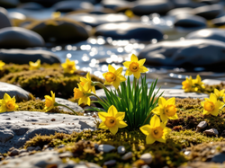 Mech, Kwiaty, Narcyzy żonkile, Kamienie, Żółte, Woda