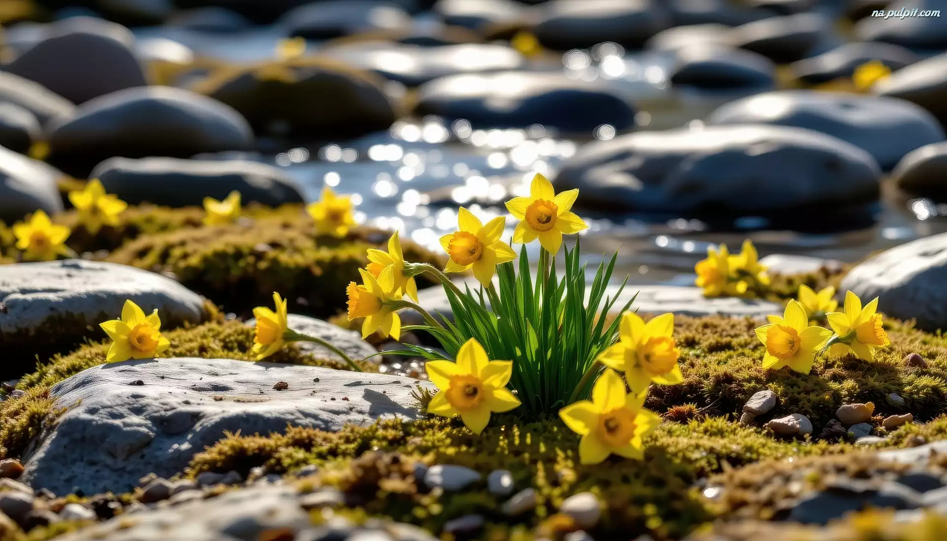 Mech, Kwiaty, Narcyzy żonkile, Kamienie, Żółte, Woda Na Pulpit