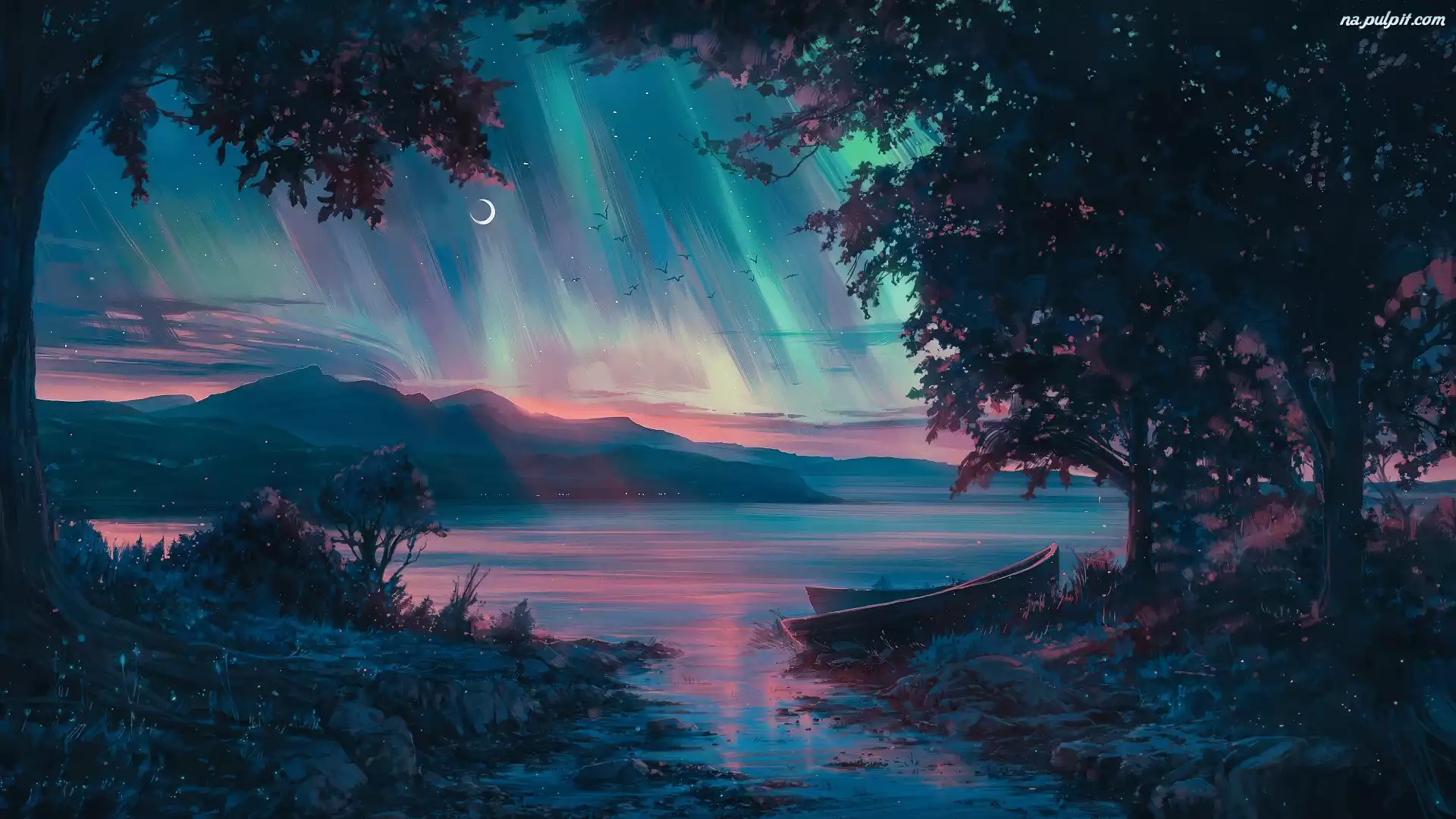 Drzewa, Grafika, Góry, Zorza polarna, Jezioro, Łódki Na Pulpit