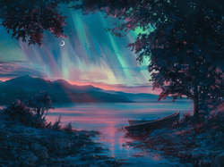 Drzewa, Grafika, Góry, Zorza polarna, Jezioro, Łódki