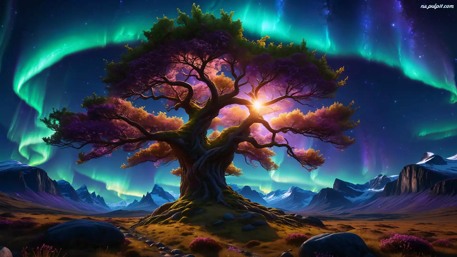 Gwiazdy, Góry, Kwiaty, Zorza polarna, Drzewo, Grafika Na Pulpit