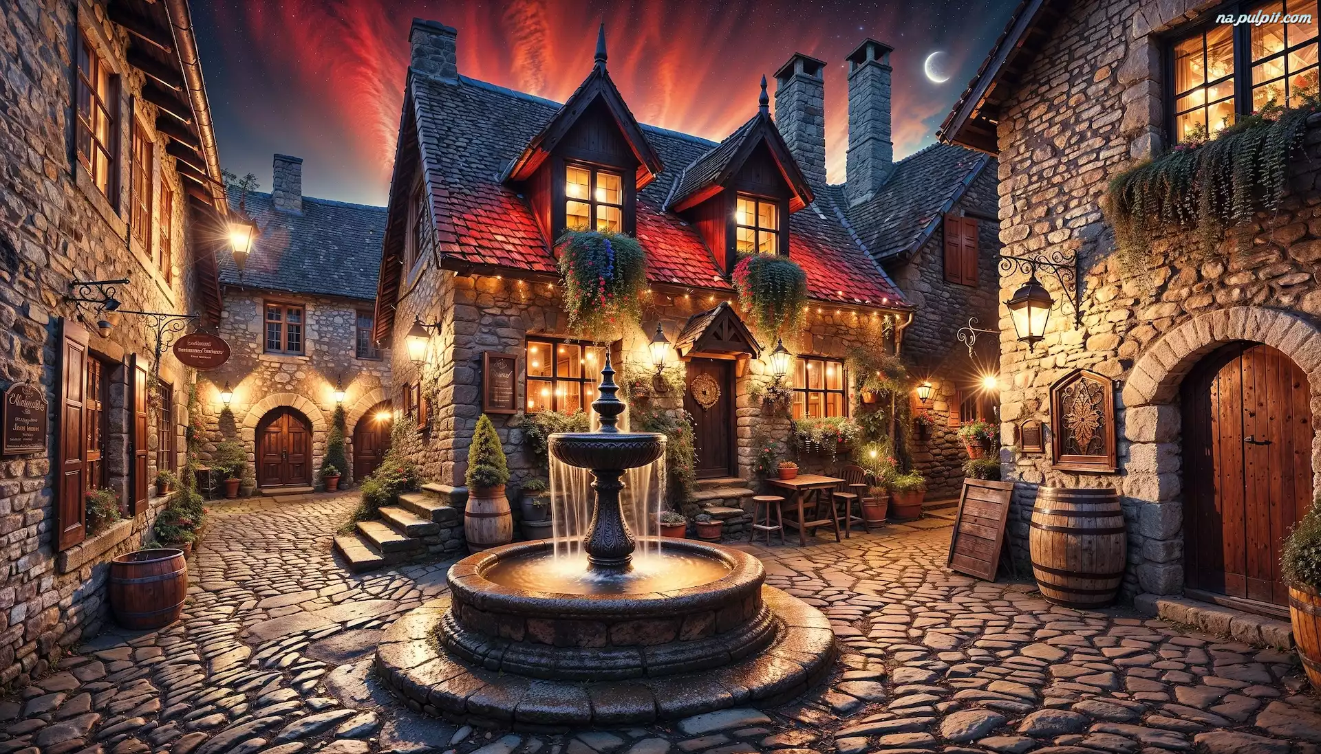Fontanna, Grafika, Domy, Zorza polarna, Oświetlone Na Pulpit