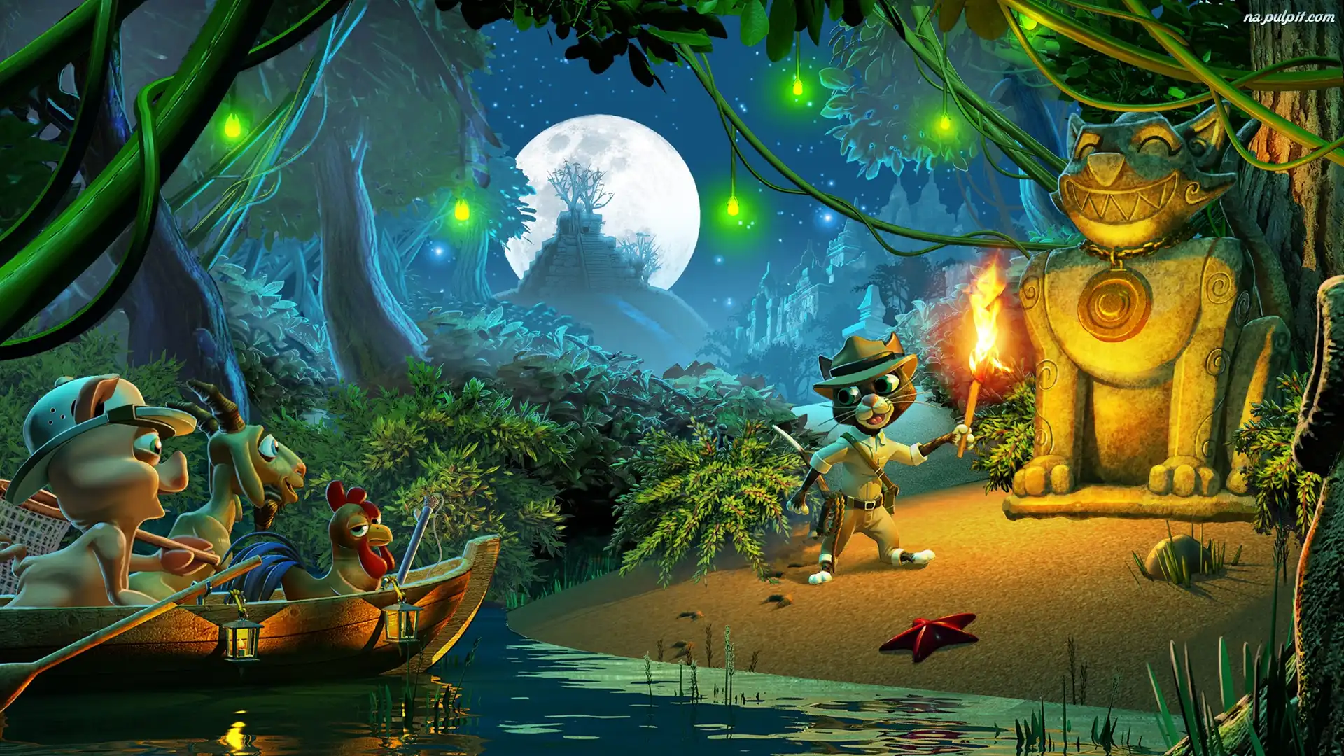 Drzewa, Łódka, Księżyc, Farmerama, Posąg, Noc, Gra, Zwierzęta Na Pulpit