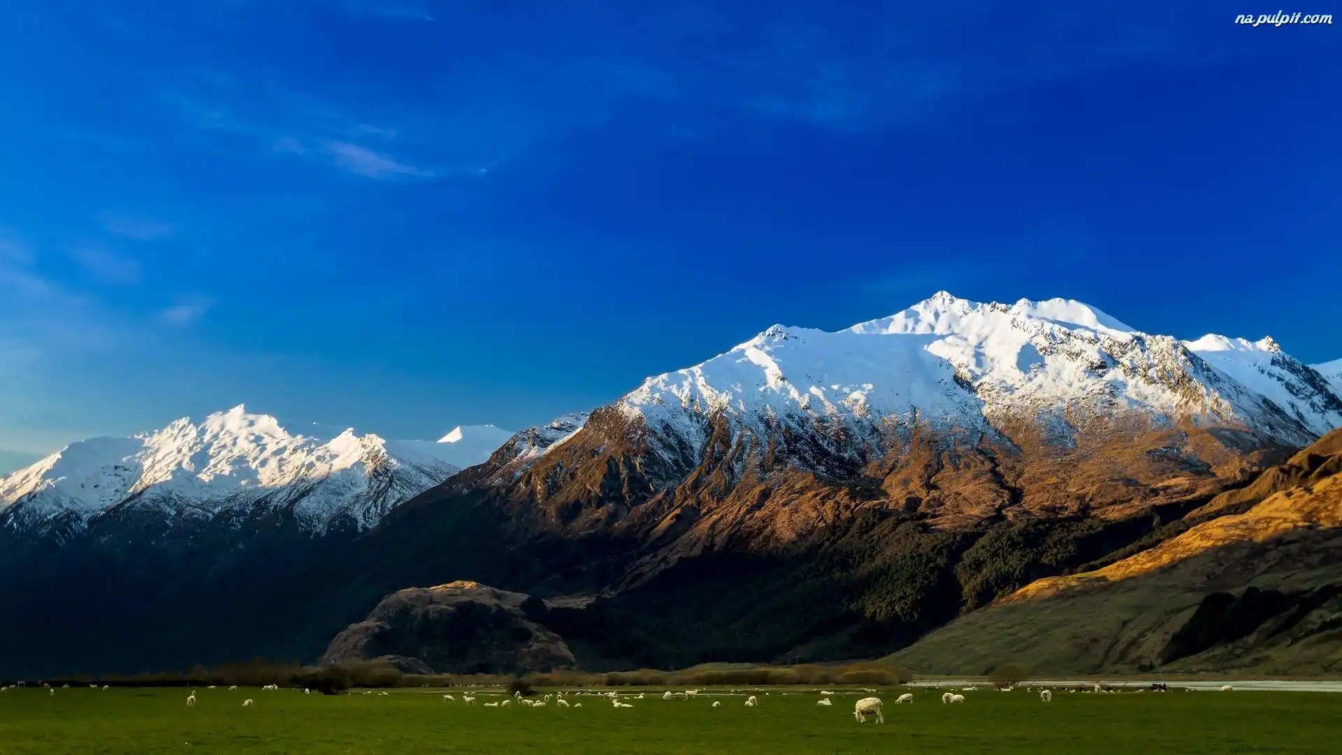 Zelandia, Zwierzęta, Nowa, Ośnieżone, Góry, Łąka, Szczyty